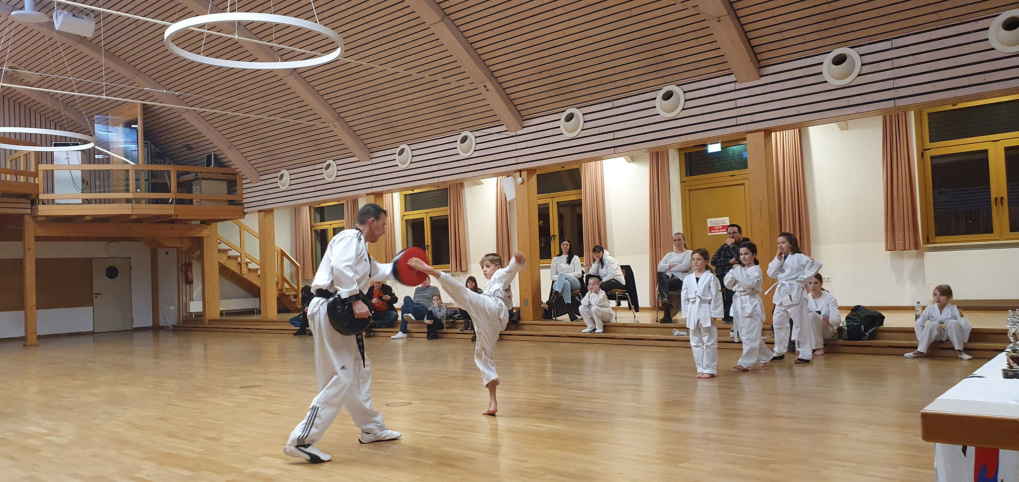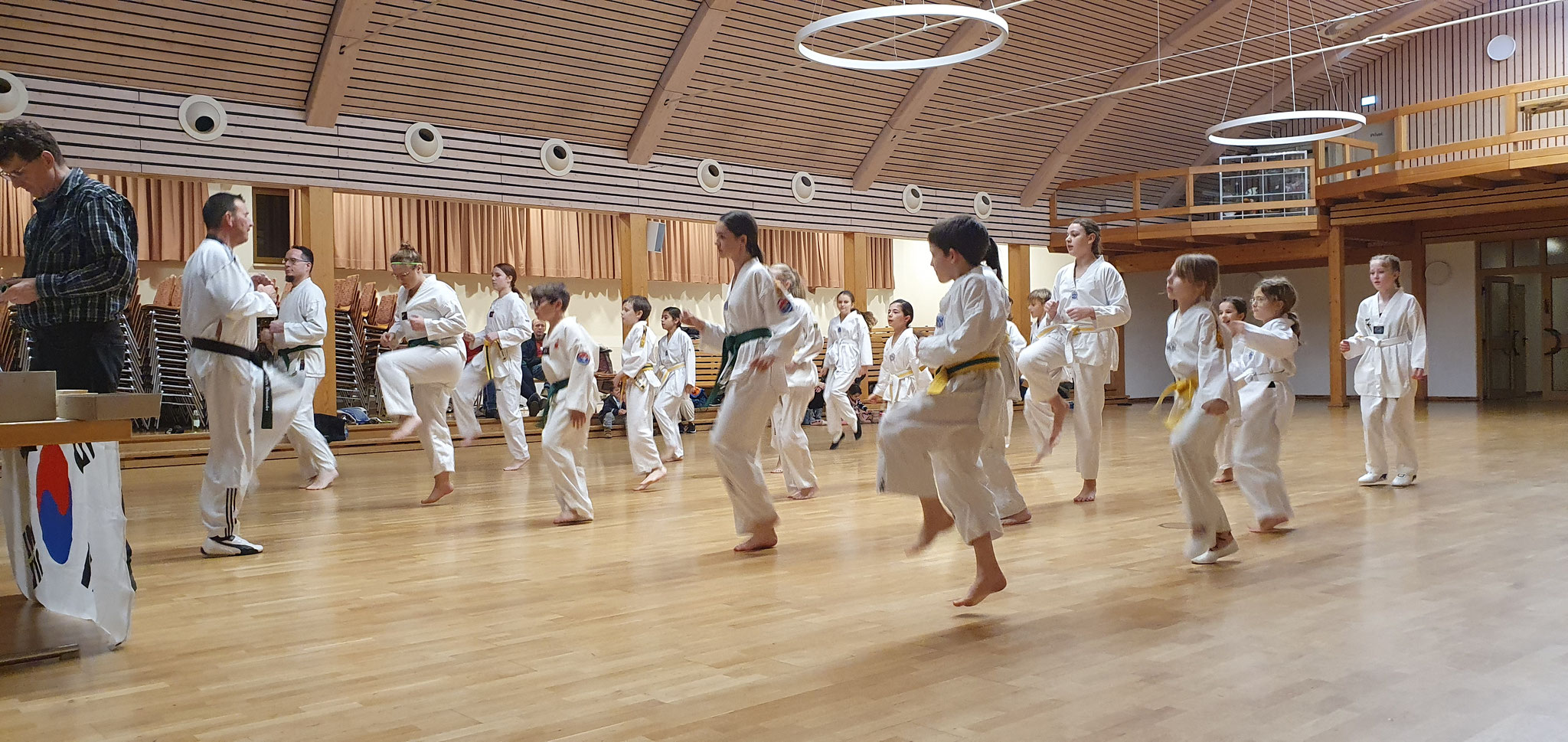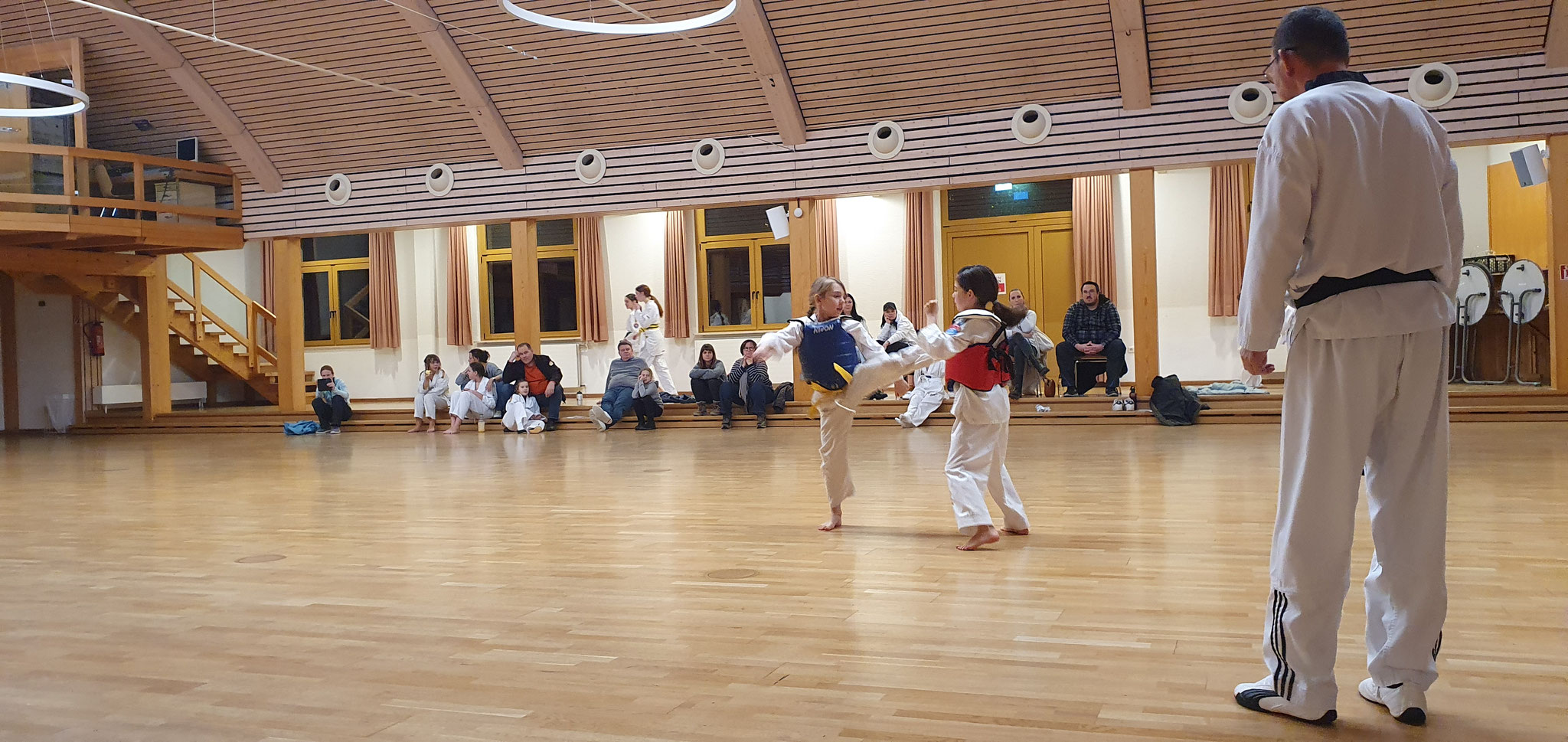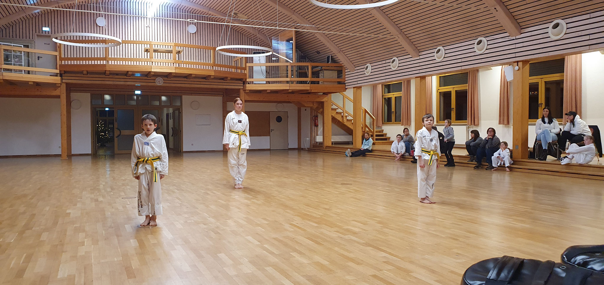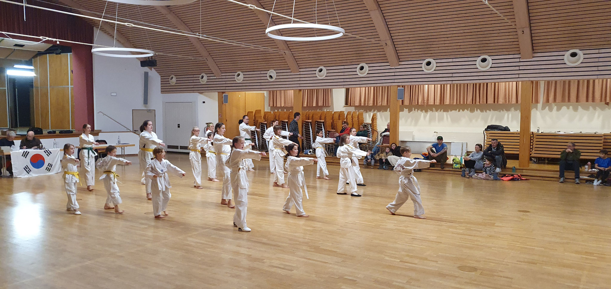 Die Prüflinge zum 9. Kup. durften als erste das Gelernte unter Beweis stellen und sich vor den zufriedenen Eltern präsentieren. Wir freuen uns, dass auch das Interesse bei den Eltern so groß ist und reichlich Zuschauer bei der Prüfung anwesend waren.