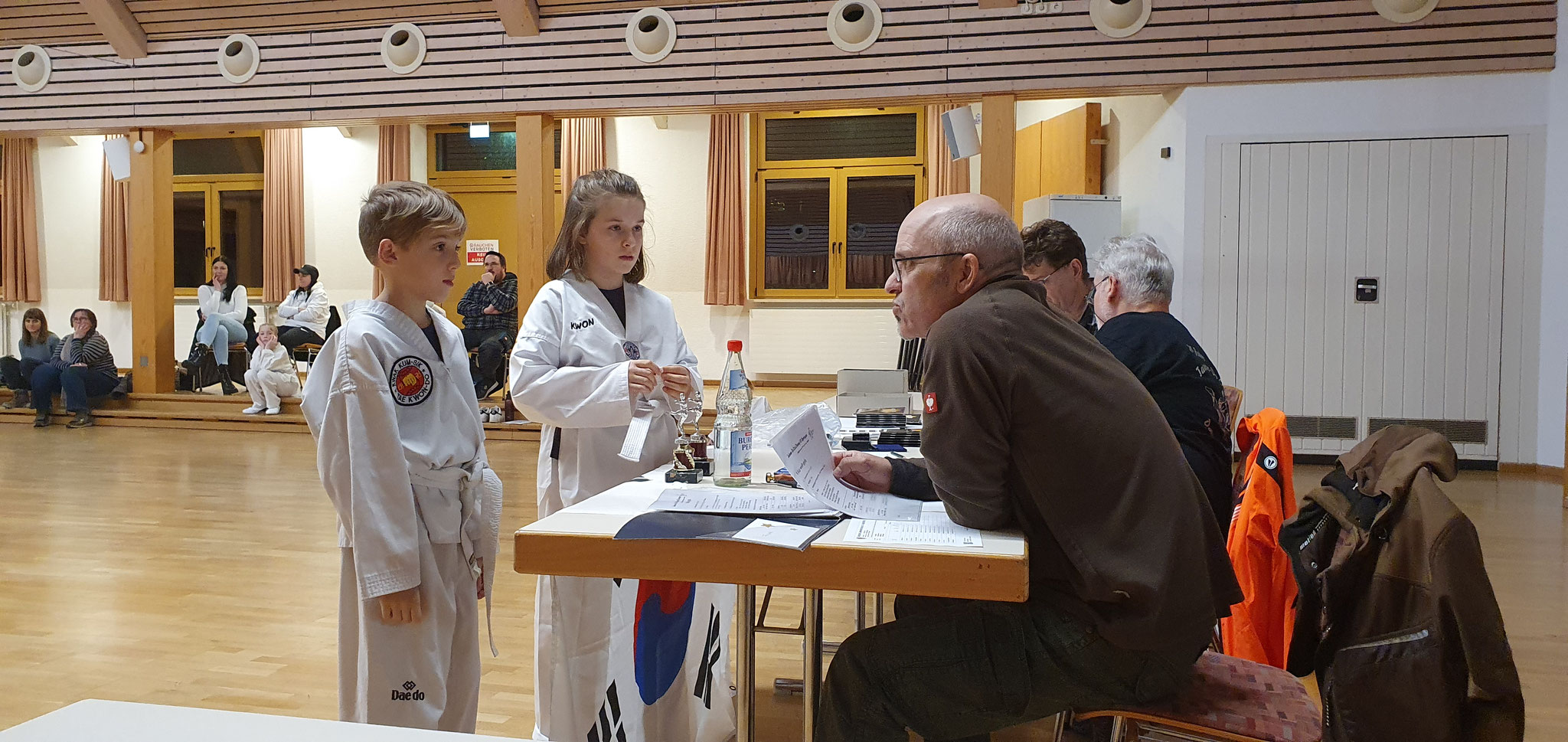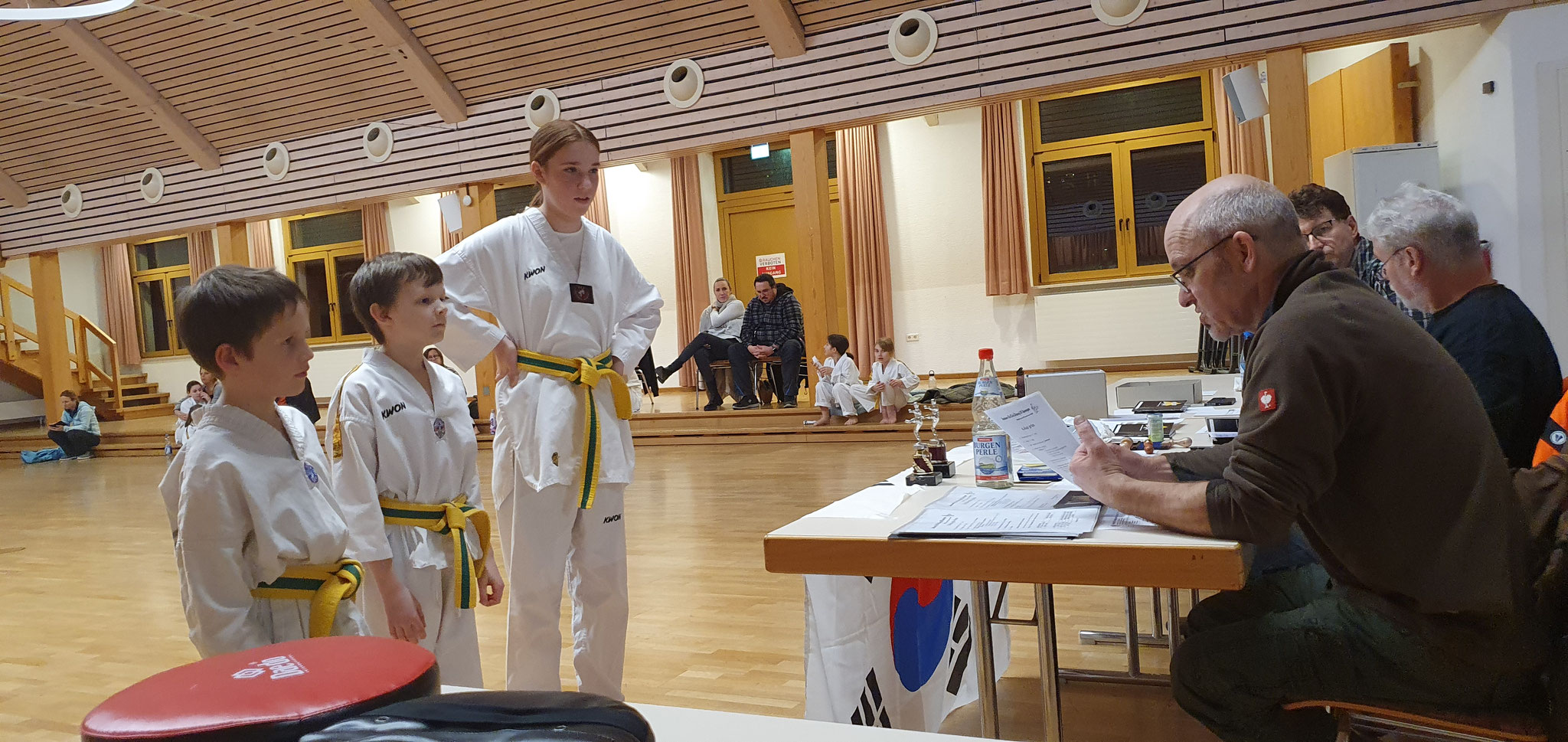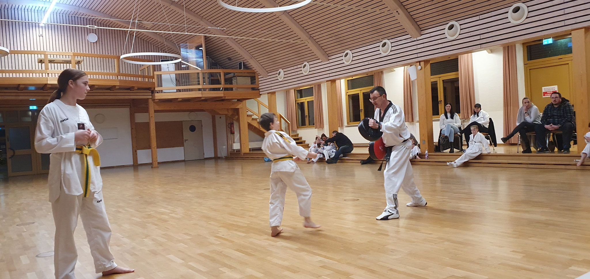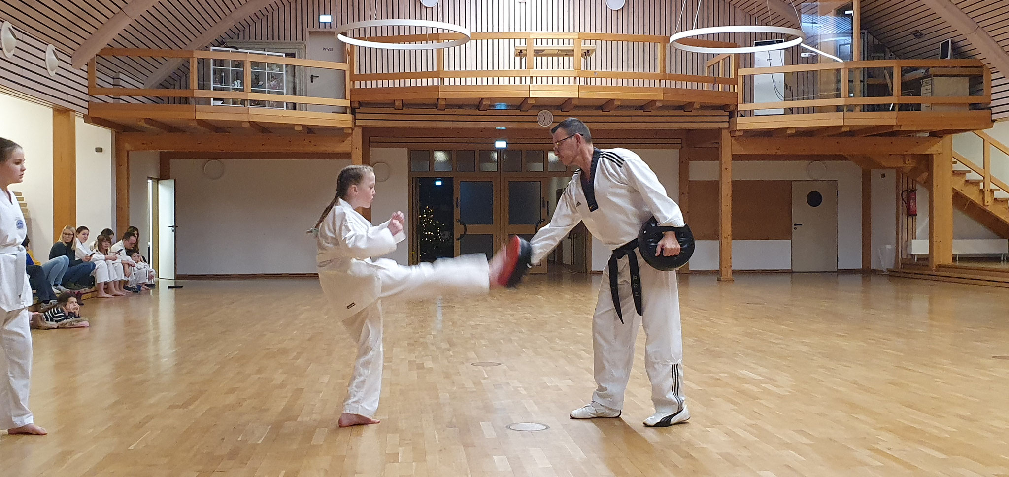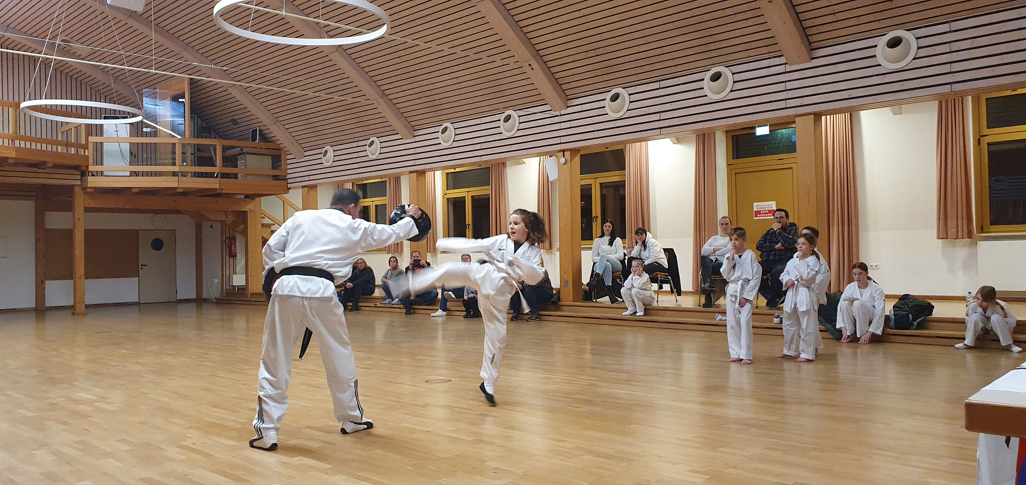 Die Prüflinge zum 9. Kup. durften als erste das Gelernte unter Beweis stellen und sich vor den zufriedenen Eltern präsentieren. Wir freuen uns, dass auch das Interesse bei den Eltern so groß ist und reichlich Zuschauer bei der Prüfung anwesend waren.