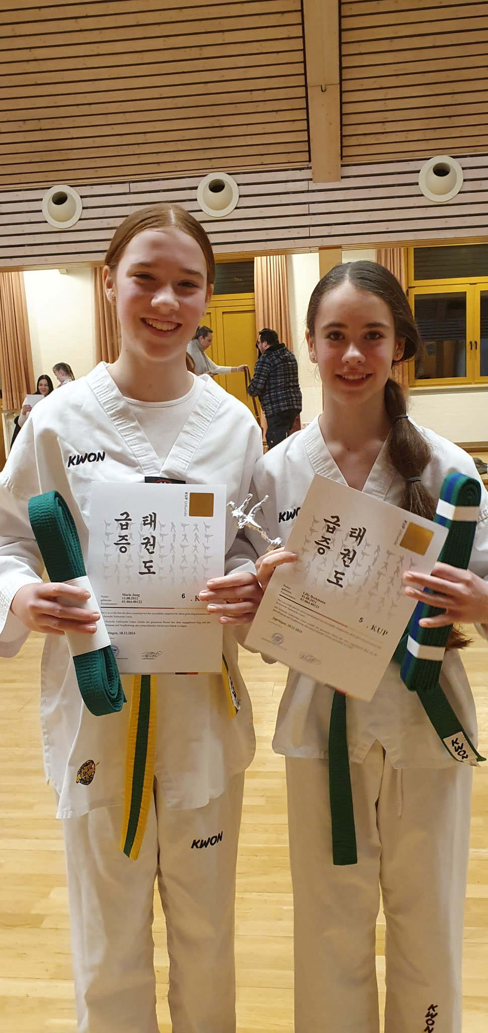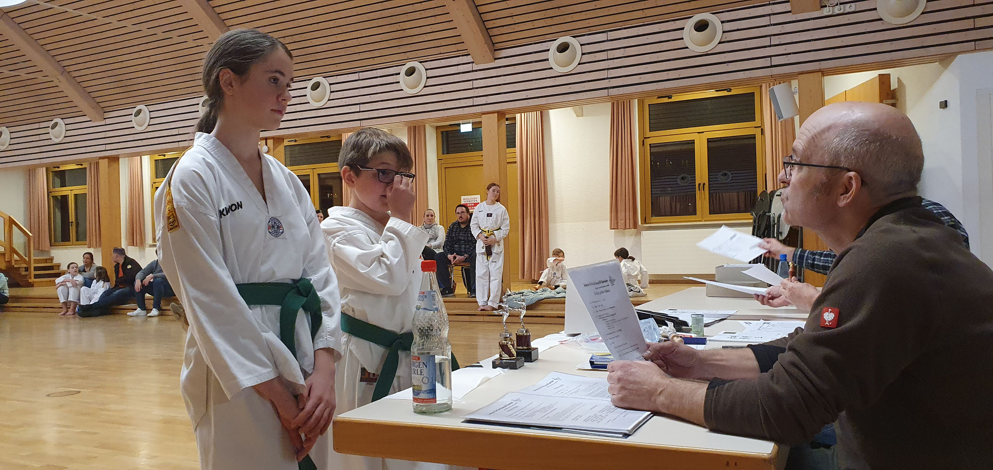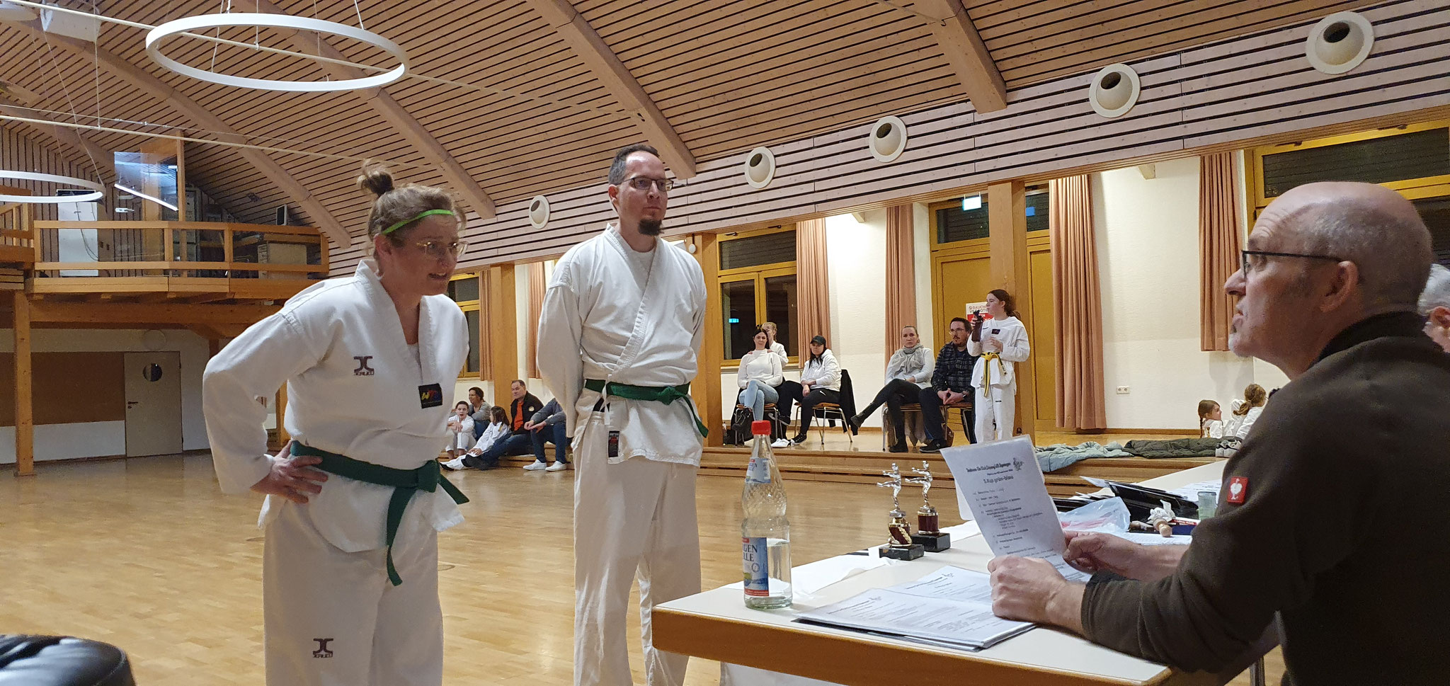 Geprüft wurde bis zum grün-blauen Gürtel, bzw. zum 5. Kup. Der Ablauf ist recht ähnlich, variiert aber in den gezeigten Formen und Abläufen je nach Schwierigkeitsgrad. In kleinen Gruppen, wurde nach den aktuellen Vorgaben der neuen Prüfungsordnung, die einzelnen Teilnehmer geprüft und mussten auch die Fragen von Frank zur Theorie bestehen.