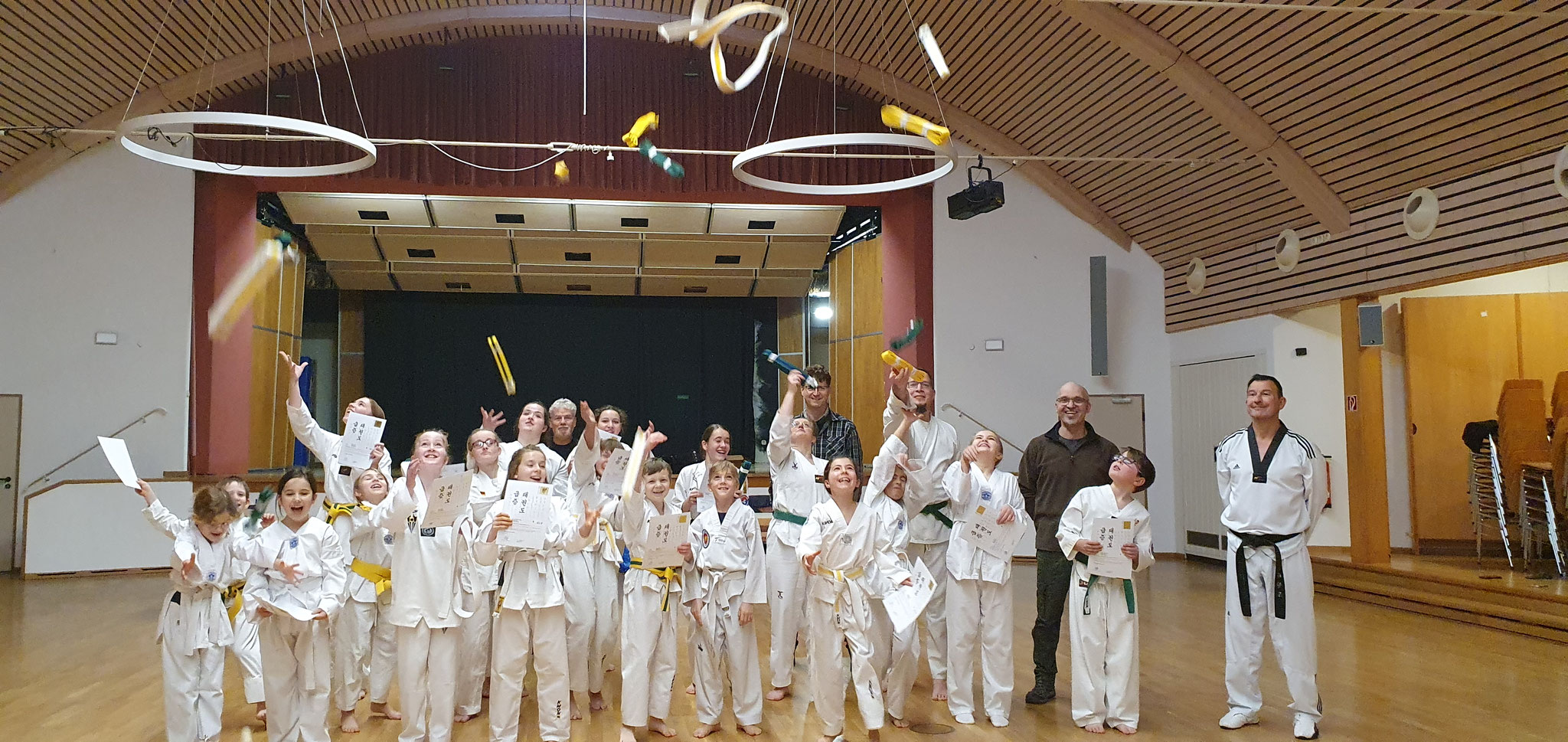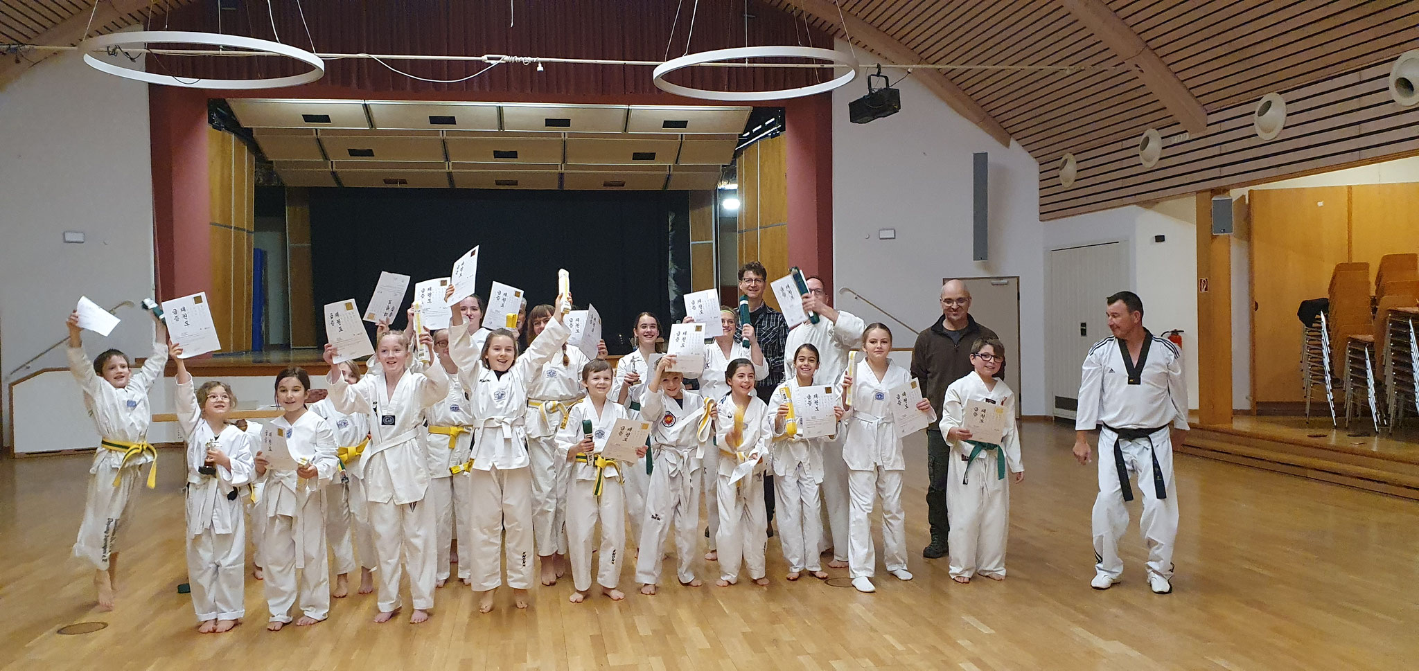 Am Ende konnten wir uns freuen, dass alle Teilnehmer die Prüfung erfolgreich bestanden haben und damit jeweils die nächsthöhere Gürtelfarbe tragen dürfen.