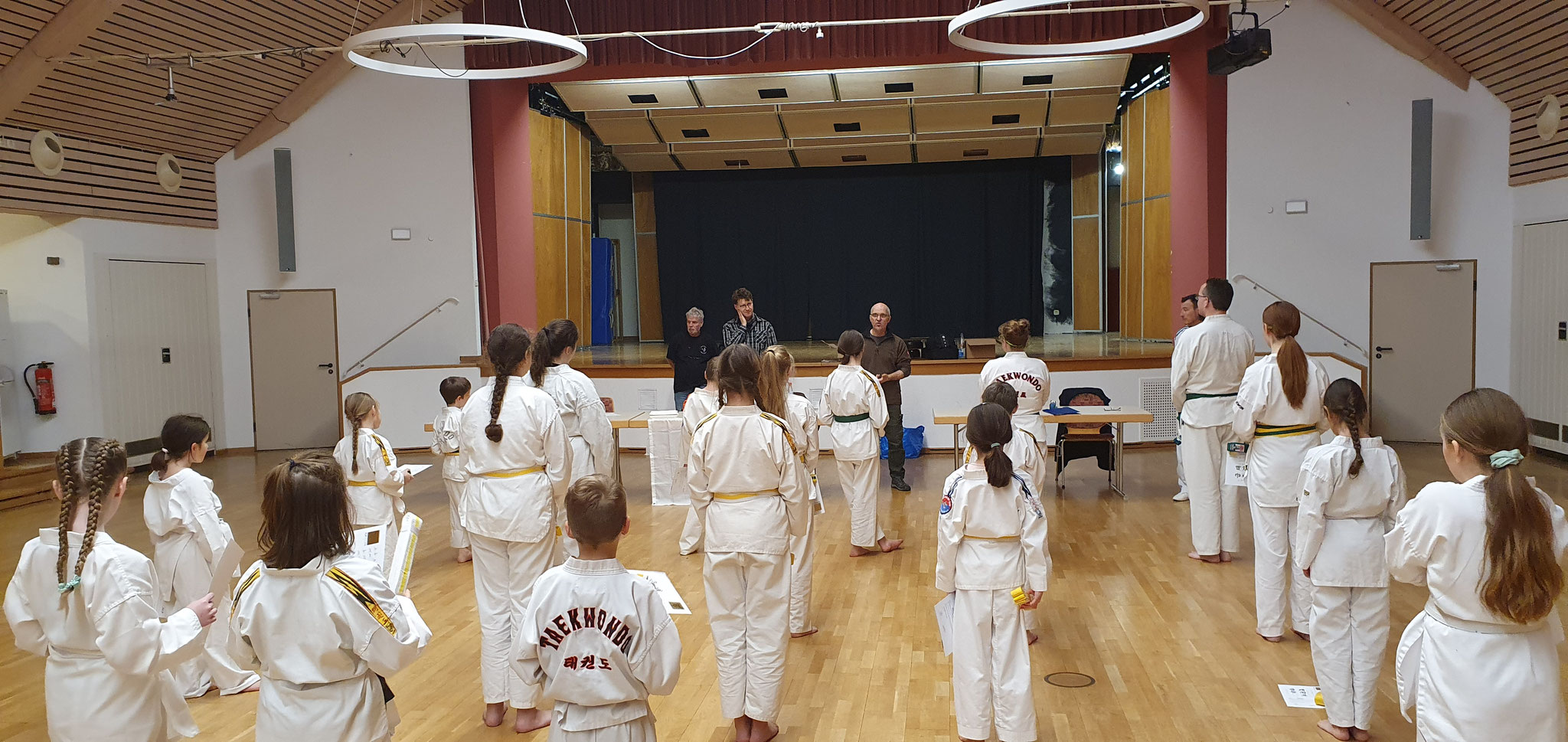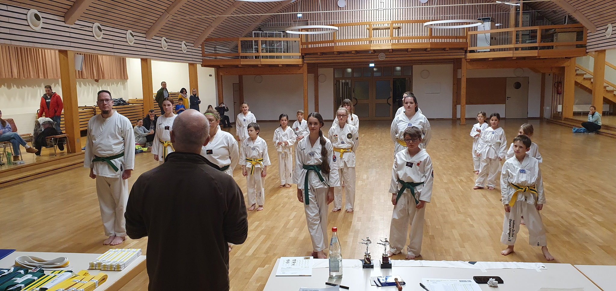 20 Prüflinge waren angetreten, um Ihre Prüfung zum nächst höheren Kup bei unserem Prüfer Frank abzulegen. Wie bei den vorangegangen Prüfungen war Volker wieder als Assistent mit viel Engagement dabei.